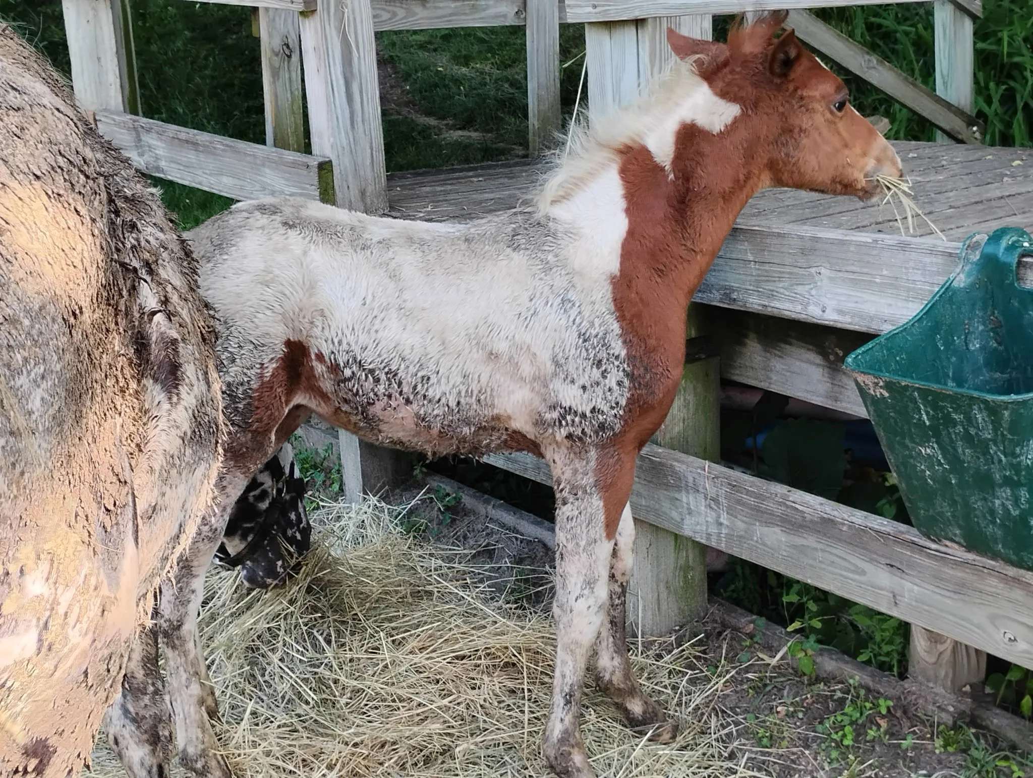 When we found Cookies and Cream (CC) and her 6-week-old foal Alice, they were locked inside a dark, suffocating stall in a pole barn. There was no sunlight, no clean space, no escape. Mama CC stood in manure so deep it reached her belly, and baby Alice had nowhere clean to lay or walk. They were breathing in ammonia fumes, living in filth, and slowly fading.